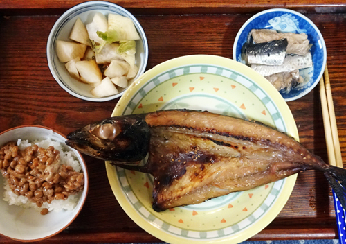 納豆ご飯に鯖の干物 自家製の、カブの糠漬けとイワシの酢の物