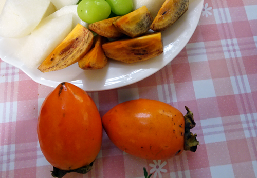 庭の柿の樹 鈴なり。それを食べれば良いのですが、スーパーで購入した筆書きです。幸田町で全国9割を栽培する、地域柿です。