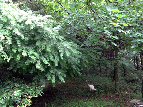 久しぶりの雨間 庭をノッコと一緒にウオッチング。ヤギ舎付近 シダレ桜は下に枝を伸ばし、クルミの木 成長著しく天へと伸びている。そして、モミジも青々。