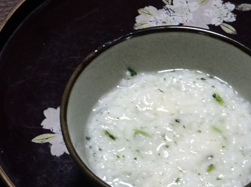 7日の朝は七草粥。この一年の無病息災の願いと、正月の飲み喰いで弱った胃を休めるためと言われています。おかゆは胃に優しい。お米から炊き上げ、小さな切り餅を入れています。