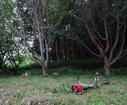 裏山の草も伸び、時折り刈っています。なるべく自然を残そうと、手をいれないのですが、ほっておくと竹藪になってしまいます。サクラの樹のしたは、刈込み、後ろのヒノキの下は、少し伸ばし、グラディエ―ション化しています。ほんの少しのこだわりです。
