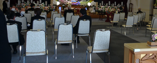 イスは、間隔を開けて置き、座るのは、親族など。一般会葬者は、香典渡しと、受け付け横でのご焼香後は、お帰りくださいとの案合表示あり。聞いてはいましたが、はじめての経験でした。