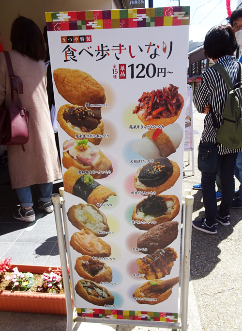 門前商店街は、名物のいなり寿司を店頭で販売するお店多数。
