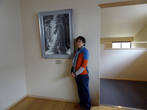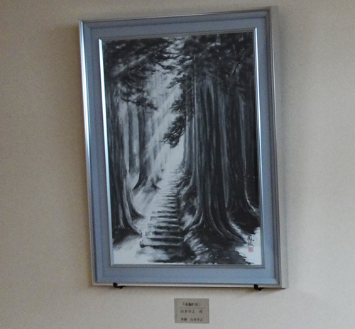 義兄作品の墨絵「木洩れ日」50号が最初の掲額作品で、「木洩れ日」白井守之作 寄贈白井守之とキャプションあり。 墨の濃淡で表現された墨絵は、深淵で環境に合っています。油絵も、私のイラストも この空間には、アンマッチングです。オープンスペースにあります。