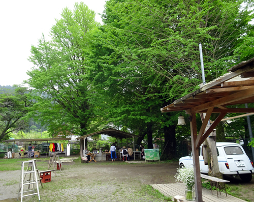 門谷小校庭は、緑の10日間開催中 日々魅力的なブース多数出店 新緑が鮮やか、ただ天気は、空に聞くしかない。
