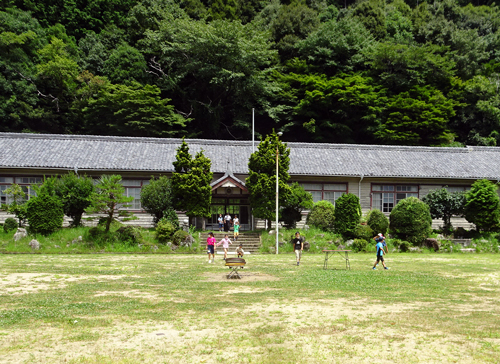門谷小学校は、子ども達の歓声が。街なかより、来訪。校舎内を駆け回り、隣の小川で水遊びし、動きまわっている。子ども元気。
