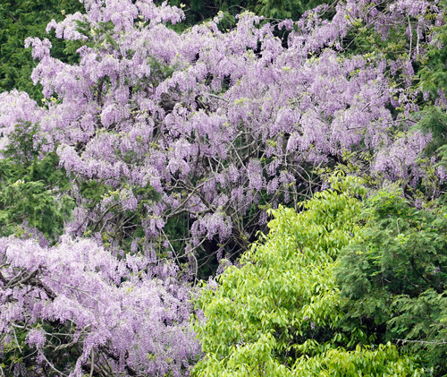 鳳来の山には、フジが満開。フジはフジ棚仕立ての名所が多いが、自生のフジ 半端じゃない高さ、大きさ。周囲のスギやヒノキの大木に負けない存在感です。