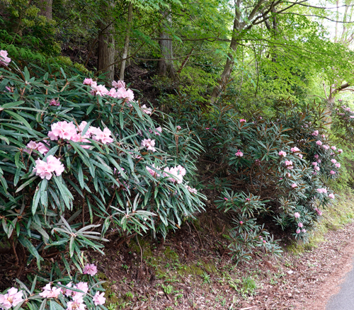 鳳来寺参道には、ホソバシャクナゲの群生が満開。東三河の岩場に自生する日本の固有種。淡いピンクに、細い葉で、ホソバシャクナゲ。奥三河の花は、ササユリとホソバシャクナゲが大好き。西洋の園芸種の華麗さと異なり、楚々とした風情に惹かれます。