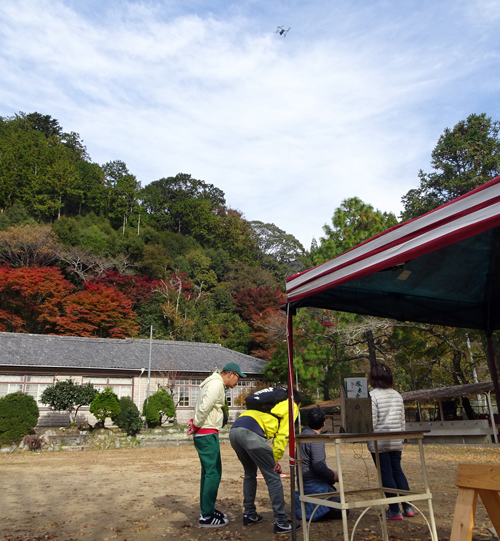 テレビ局が取材に来て、ドローンで空から、紅葉を撮影していました。3枚目写真の右上空にドローンが飛んでいます。