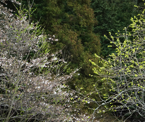 今 庭のサクラとカキの新芽の競演です。