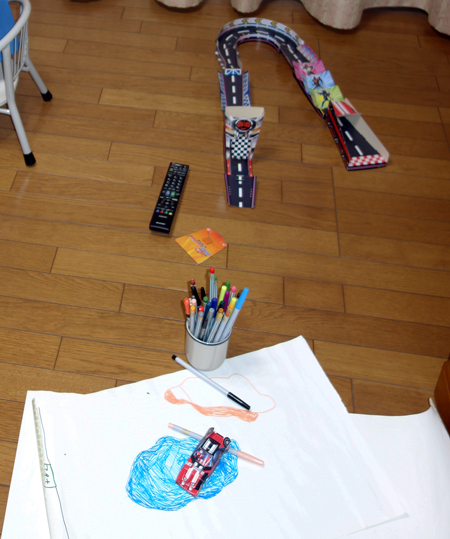 仕事をおえて帰宅したらY太が、ブログに載せてよとのリクエスト。最近ヤギ登場回数が増えて、Y太、K太を紹介していなかった。さっそく、遊んでいたシーンをアップしました。Y太の絵は手前の青がゴルフのグリーン、向こう側がバンカー これを目がけて、ゴルフボールならぬ自動車が突入という、立体作品です。いいセンスです。ゴルフは周囲の影響か? 知識豊富です。