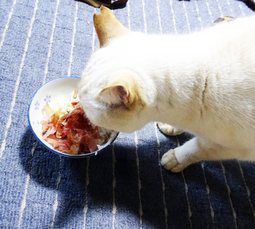 普段は、おやつに、パックに入った、薄い粉カツオを食べているので、時にはむせる。削りカツオ節は、歯ごたえがあるので、更に美味しいと感じたようだ。