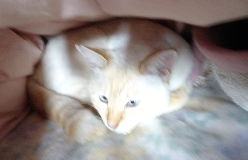 今 昼間は、一緒に日向ぼっこ。背中を撫ぜると気持ち良さげ。室内では遊びつつ、布団に潜り込み、布団をめくるとな~にと挨拶、夜は布団の横のネコベットで寝ている。