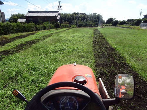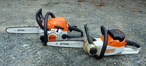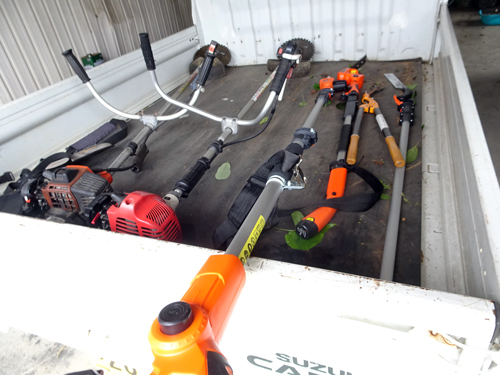 農機具も変化し、エンジンから、モーターに移行しつつです。トラックの上の農機 向って左から、エンジン式草払い機2台。モーターの高枝枝切りノコギリと、電気ケーブル無しのホソバ刈り機。チエンソーは手前 モーター 後方エンジン式です。