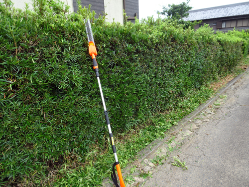 今年は新兵器の生垣バリカンは、充電式で軽い。以前は、電気式だが、電源ケーブルの延長ケーブルのひき回しが大変で時には、ホソバを切らず線を切ることも。