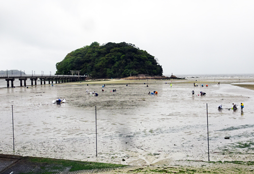 小雨の中 竹島海岸では親子連れが アサリ狩りをしていました。