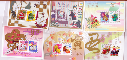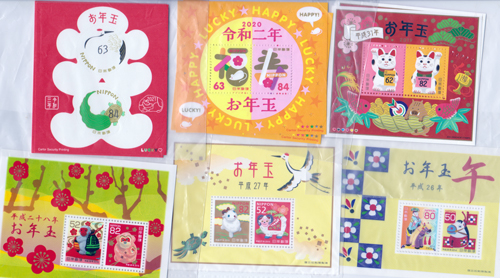 年賀状お年玉くじ 当選で妻が郵便局へ交換に。今年はシート4枚当選です。毎年数枚当たるので、コレクションしています。