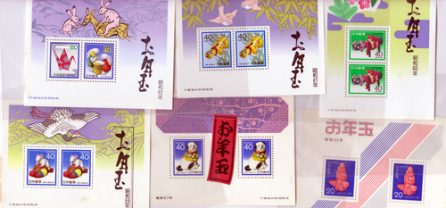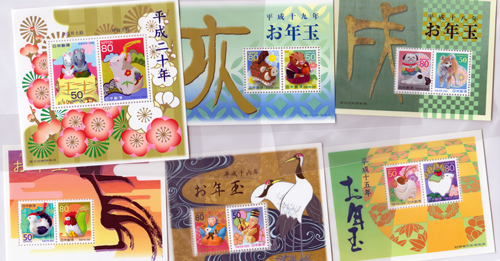 最初の左上の大入り 今年のシート ポップです。また、今回から、水なしで貼れるシール式となりました。イラスト展の案内DMハガキ。キテイちやんやドラえもんのシール式切手を貼って送付。手間いらずで、可愛いイラスト切手は便利です。