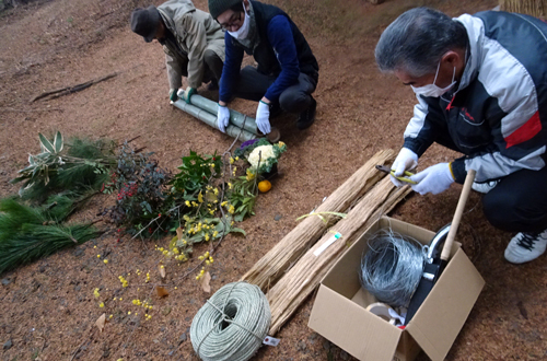年1回作業なので、前年門松写真とマニュアルを見つつ完成。手も動くが、口も動く和気あいあいの作業。毎年微妙に異なるオリジナル門松です。門松前で記念写真。皆 達成感の笑顔です。