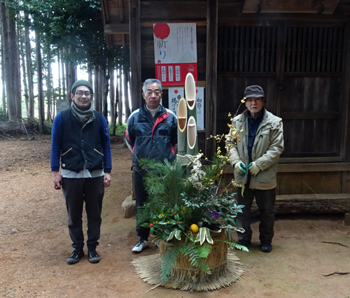 恒例の門松作りです。区運営、管理の火防の神さま 秋葉神社の迎春準備で、神社総代4人の手作り。
