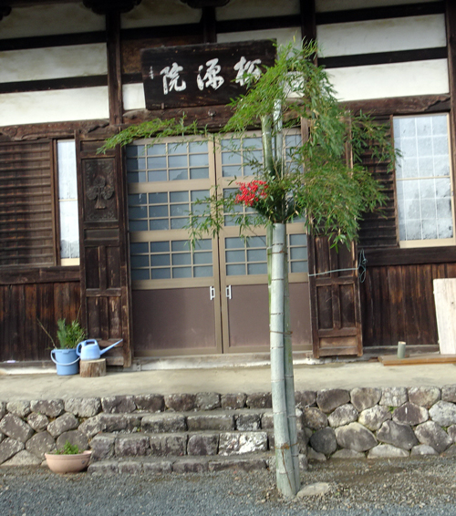 松源院の門松は、個性的 太い竹で作り、天にも昇る高さです。