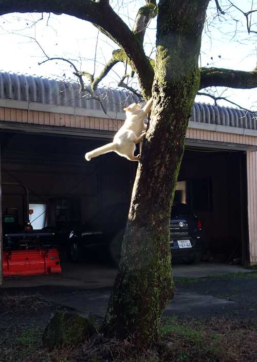 ノッコはほめて成長するタイプ。嬉しくて、カキの樹にダッシュで登り、ご機嫌です。