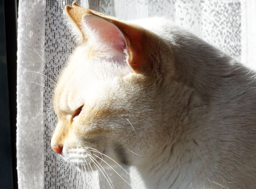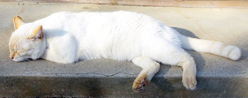 思い出すのが、数年前 カラスミつくりにチャレンジしたおり。カラスミは魚のボラの子を、塩水につけた後に天日干しにします。酒の肴に楽しみにしていたら、白いネコがジャンプして、ネットを破り中のカラスミをとり去っていきました。あらあらと思い、ネコはサカナ好きだと納得。シロネコ 痩せていた印象。
