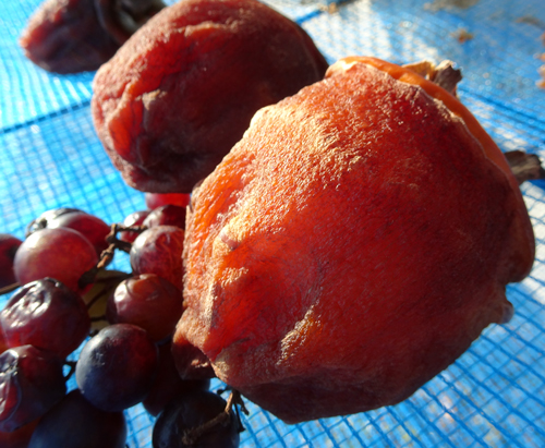 干し柿つくり中です。本来なら、渋柿の皮を剥き、外で吊してつるし柿。今回 簡単に、網ネットで干しています。この網ネット 普段は切干ダイコンづくり使っています。