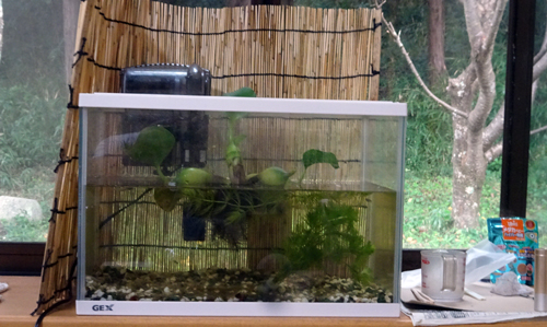昨日 豊橋の大型園芸店 ガーデンガーデンへ行ったおり、親切な店員おじさんが説明。今年は、家めだかが夏死ぬこと多い、環境が暑い室内 水槽の水温が上昇。年寄りメダカメダカダメージが多い。また、メダカの寿命1~2年。たしかに、小メダカは元気です。