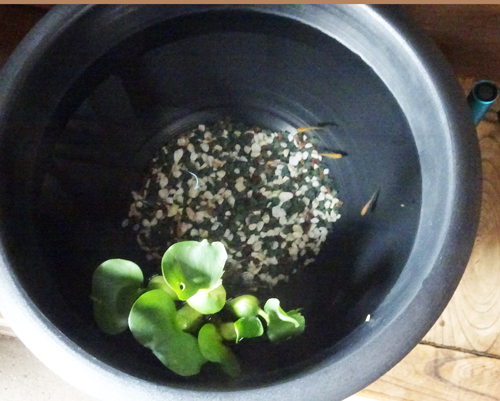 別環境で育てようと、メダカ購入。メダカ10匹 メダカ鉢 水草 カルキ抜き剤で計2,500円 玄関先の涼しい場所にメダカ鉢を置きました。メダカハウス2です。