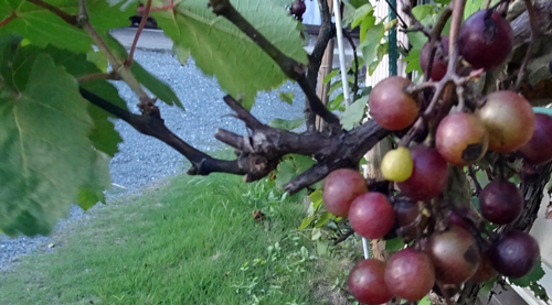 今年の庭のブドウの樹は実りが少ない。品種は、マスカットべりーA 葉が虫害、枯れ、実も思うように熟さず、寂しい状態です。カラスは、寄って来て実を啄み、せっせと食べてくれています。美味しく実ったブドウを食べられると残念だが、不揃いのブドウを食べてくれるので良しとします。