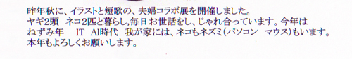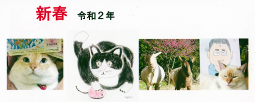 私は、ネコです。キツネ目ですがキツネではありません。私は今、ノラではありません。家ネコになりました。でも昼間は地域パトロールをしています。私は、家族として迎えられ、大事にされています。何か、ネコの恩返しをしたいと思っていますが、居てくれるだけで良いようです。来年もよろしく。ニャー。