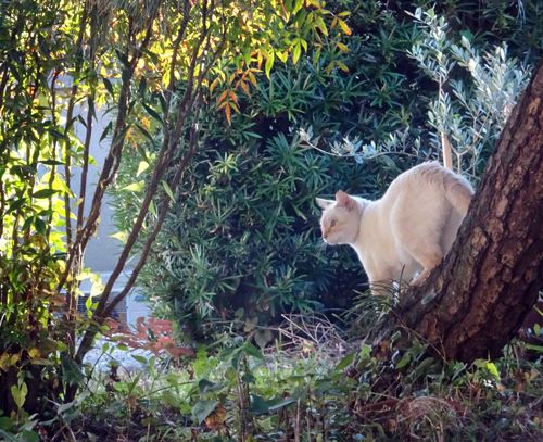 ノッコと庭を散歩すると、気が向くとカキの樹に登り、細い枝でどや顔。そして、垂直降下。家に入ると、ノコノコとついてきます。これをネコの恩返し?