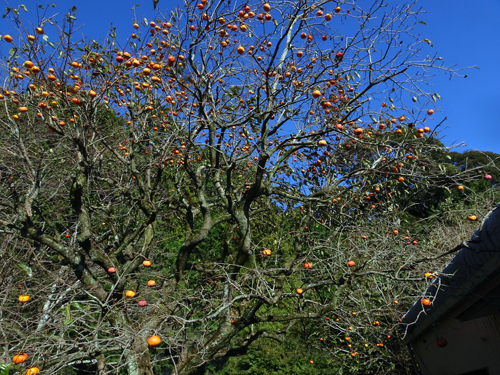 庭の柿の実熟し、メジロのエサです。