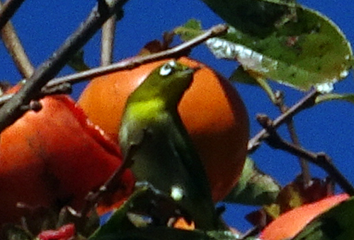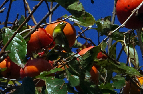 今 実が熟し果肉が柔らかくなった朝晩 メジロの群れが押し寄せ、カキを啄ばんでいます。2030羽がカキの周りを群舞。メジロおしとは、納得の表現です