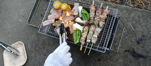 親子で、準備。父親は、肉を焼き、子どもはエビを焼きく。炭火焼き肉は美味しいし、皆でワイワイ食べるのも美味しい。