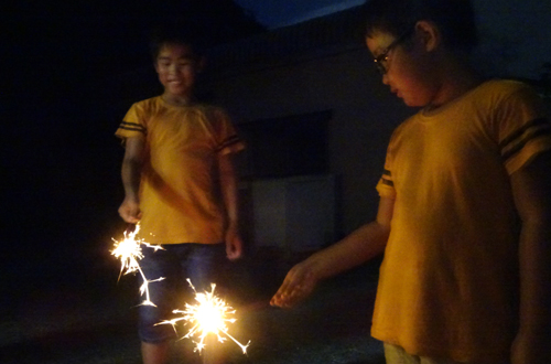 13日は、お墓参り 松明たいて迎え火。孫たちも参加。
