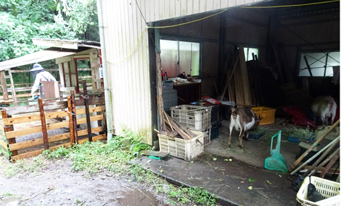 雨時は、ヤギ舎から出ず。小雨時は、散歩には行かないが、隣の農業用倉庫まで、夕食を食べに行きます。濡れないように、頭を下げて一目散です。