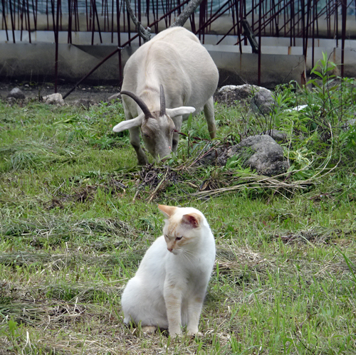 ヤギは、草をほおばり、ネコはどこからとも現れ、一緒に居る。
