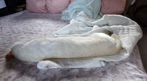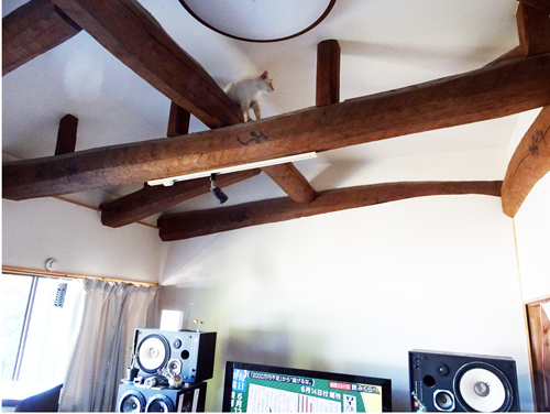 今までも室内の、高い所へ登ってドヤ顔でした。でも、今回はハイレベル。梁に登ったはいいが、どうにも下りれず、ミャー ミャーと上からアピール。