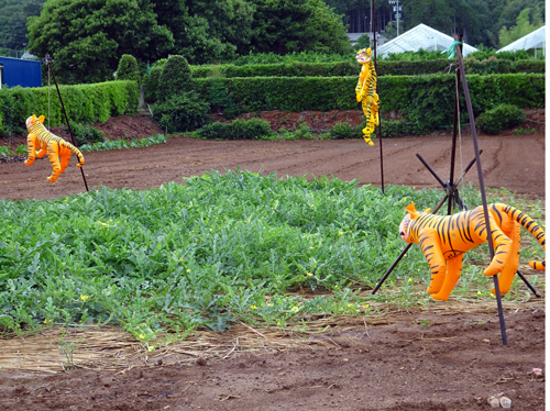 写真のスイカに、トラの風船を置く。→評価ありですが、皆 効果があるかをこのスイカ畑で見守っています。
