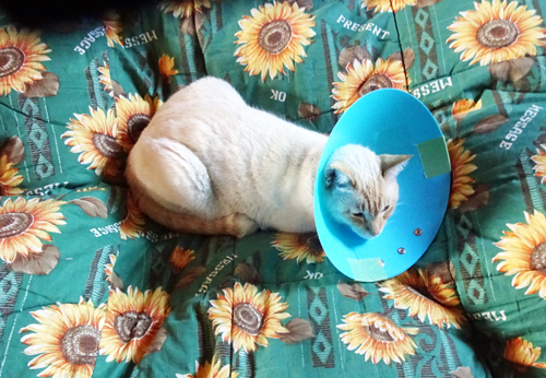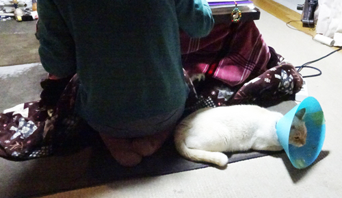 患部をカラー保護しての不自由生活、そして外へ出たいが これは諦めた。室内で飼い主2人 交互にお世話をしているので、甘える 甘える。もう、お嬢様 おネコ様です。
