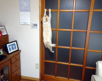 室内で、2人。いつもはノッコがリーダーなのですが、カラーしているので動きが不自由でトモのサポートを受けています。写真の引き戸 ノッコは閉めていても、手で開けることができる賢さ、今 カラー付けているので開ける事が出来ない。そこでトモ 戸を、開けようと思ったが出来ず、ジャンプしたがダメ。二人で仲良く? 遊んでいました。