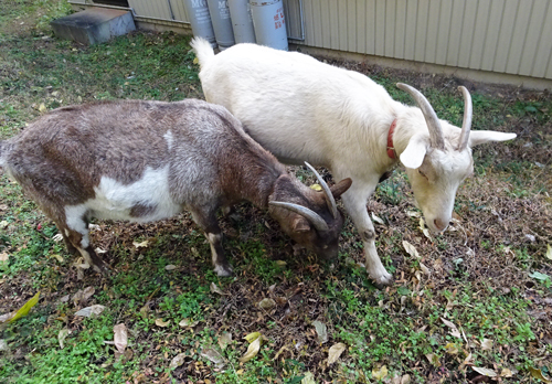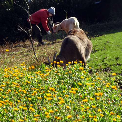 ヤギたち昼間は散歩で、家周りの草を食べています。真冬でも、畑には新芽や花有り。クマのように冬眠しないが、冬も爆食いです。