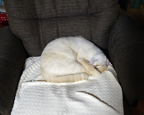 今日朝は涼しかった。一気に5度は気温が低くなった感覚です。ノッコも、毛布の上で寝ている。