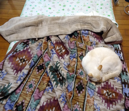 夜は、ノコノコ来て一緒に寝る。遠慮という言葉はネコにはないようだ。スリスリくっつき甘える。寝る時も、布団のど真ん中ですやすや。写真は遠慮しがたちな寝場所。睡眠不足気味と配偶者にいうと、どかしたら 寝がえりでつぶしたらと困るというと、ネコ俊敏という。納得。