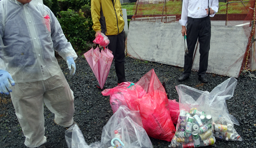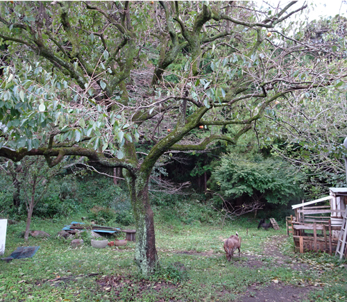 柿や、サクラの葉が大量に落ち、朝 美味しそうに食べています。空からご馳走がおちてきました。
