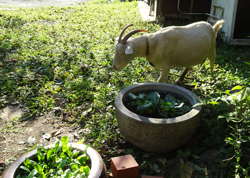ヤギたちは、雨風の強い時に、懐中電灯で室内を照らすと、2頭とも不安げにこちらを見て立っている。