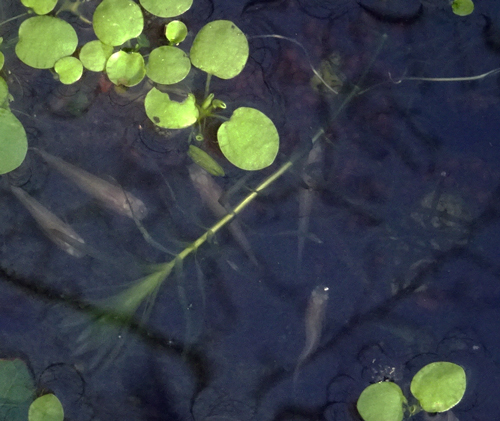 毎日見ていると、名前と顔は分からないが、何となく行動は理解できる。石臼内には、水草と共に、小さな小さな、小豆粒大のヒメタニシが増え、共に泳いだり、石にくっついている。時にはタニシ2匹でじゃれ合っている。ヒメタニシはコケを食べたり、水質の浄化をしてくれるのでありがたい。