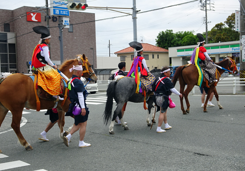 神社へは、徒歩ならぬ乗馬で、青信号を静かに渡る、運転手みなオーです。後ろに馬糞をかたずける担当あり。